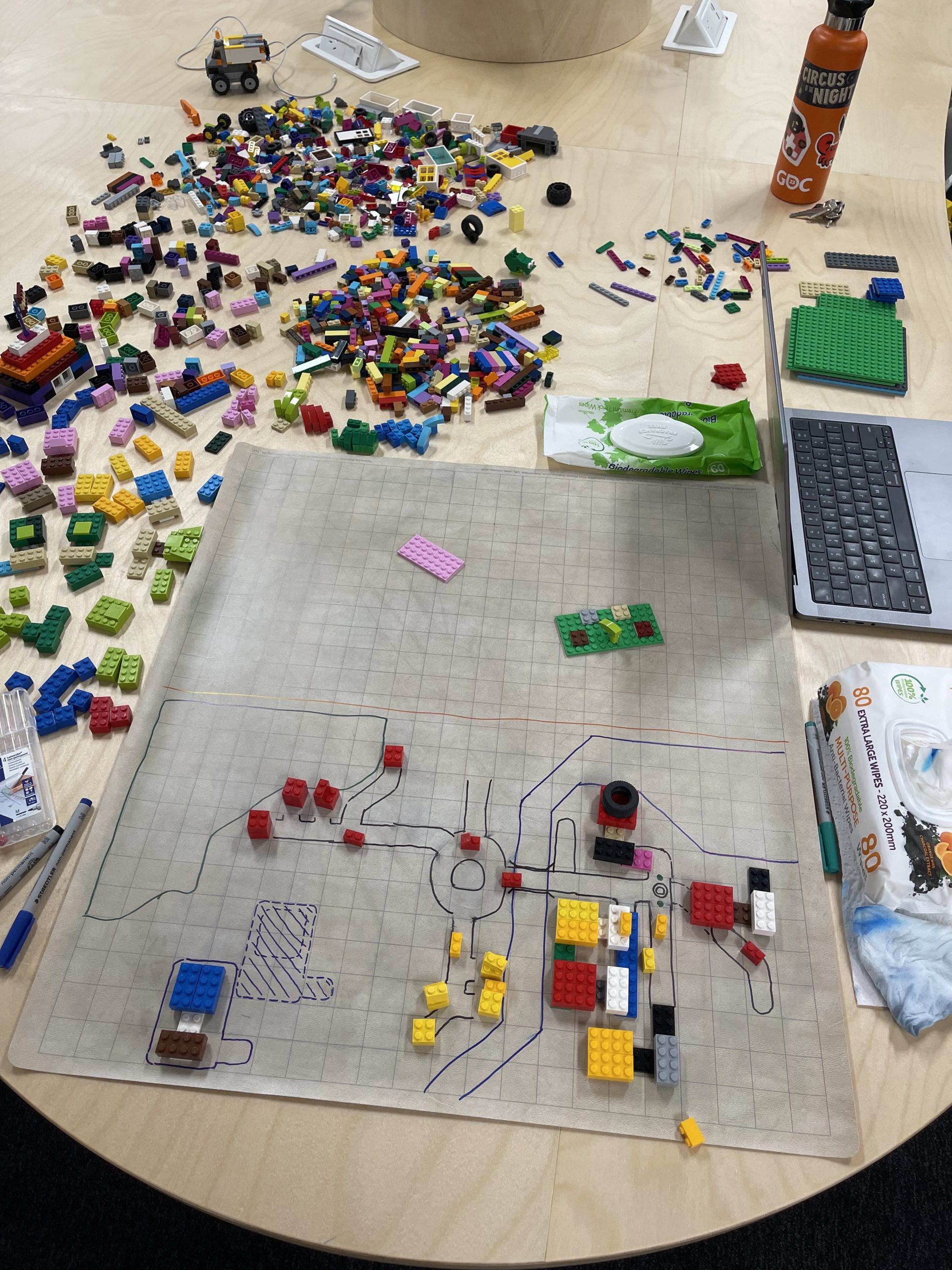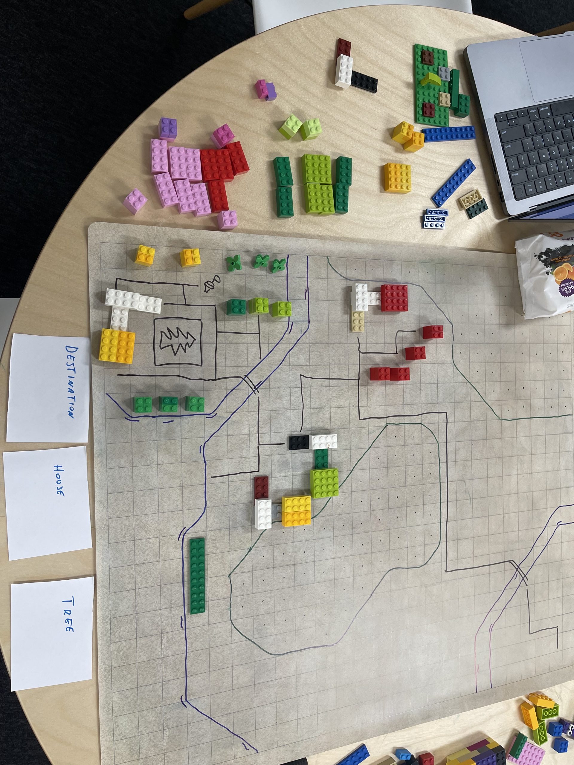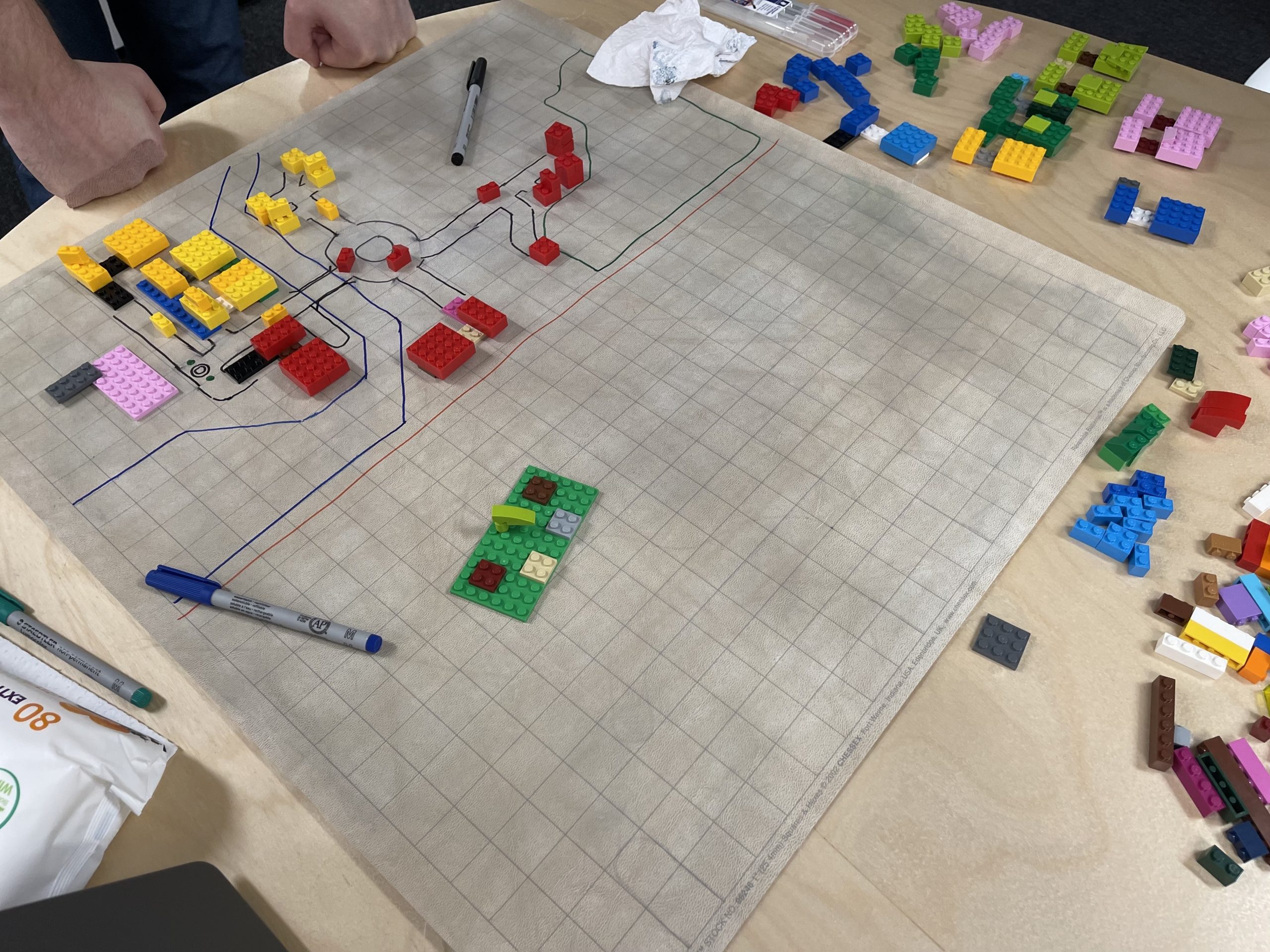 Designer Tom Butler even dug up the old photos featured in this article. “The early concept work of Creative Mode was SO much fun.” When the first early concepts for Creative Mode were in the brainstorming phase, the team worked through them by drawing maps, roads, and pathways on graph paper in a big table in the middle of the office. These drawings eventually grew to include Lego houses, cars, minifigs, paper cut-outs of whole neighbourhoods, and other assorted bits and pieces.